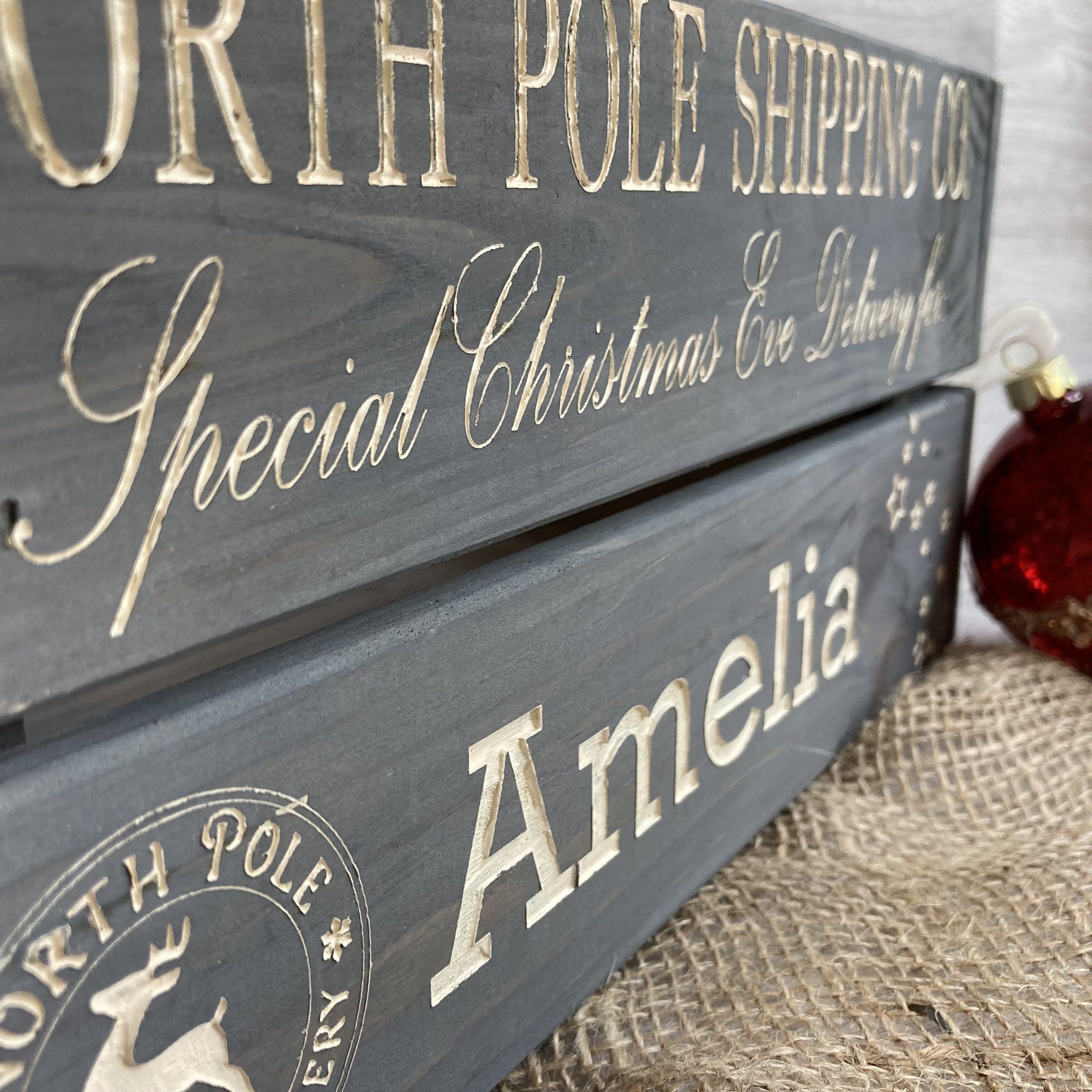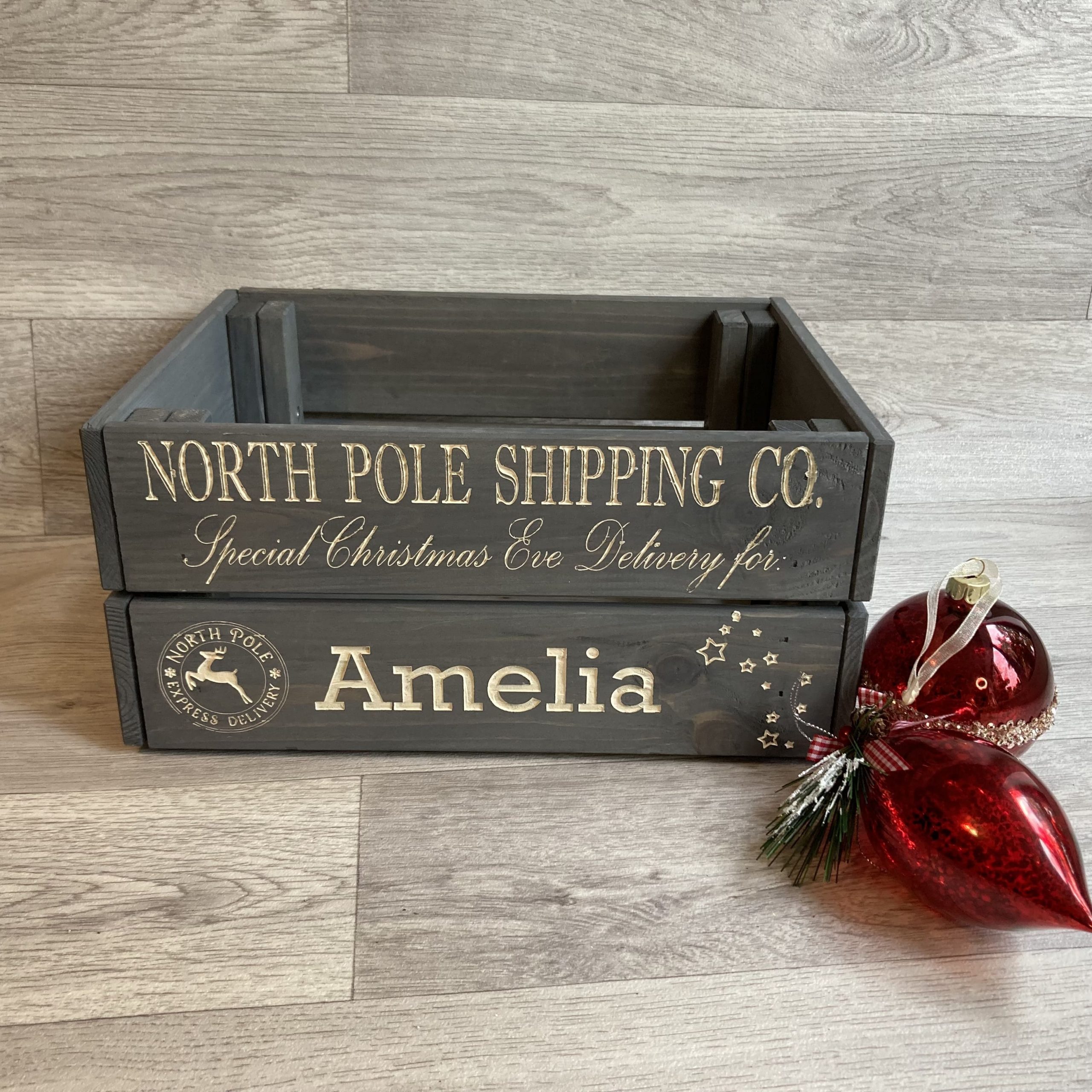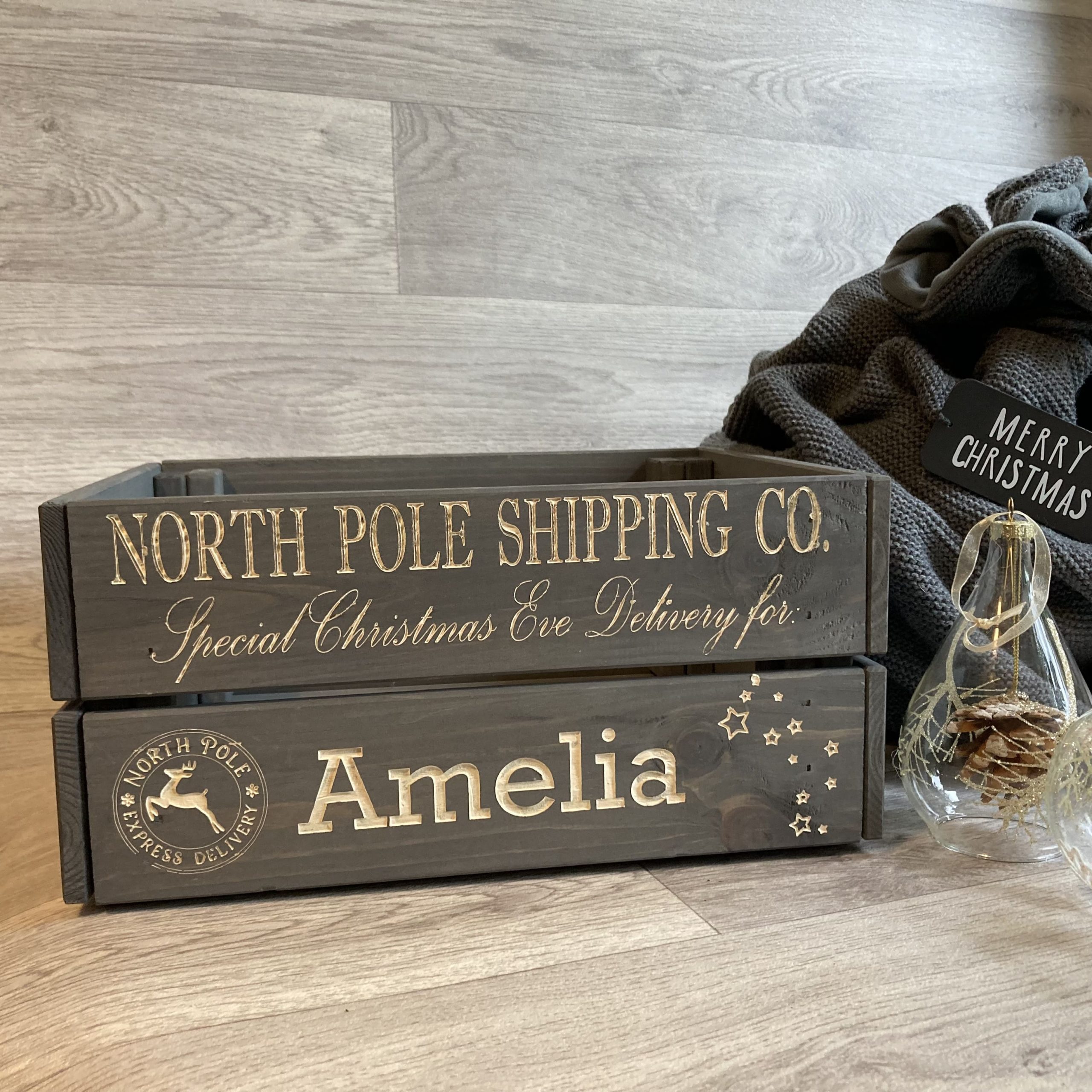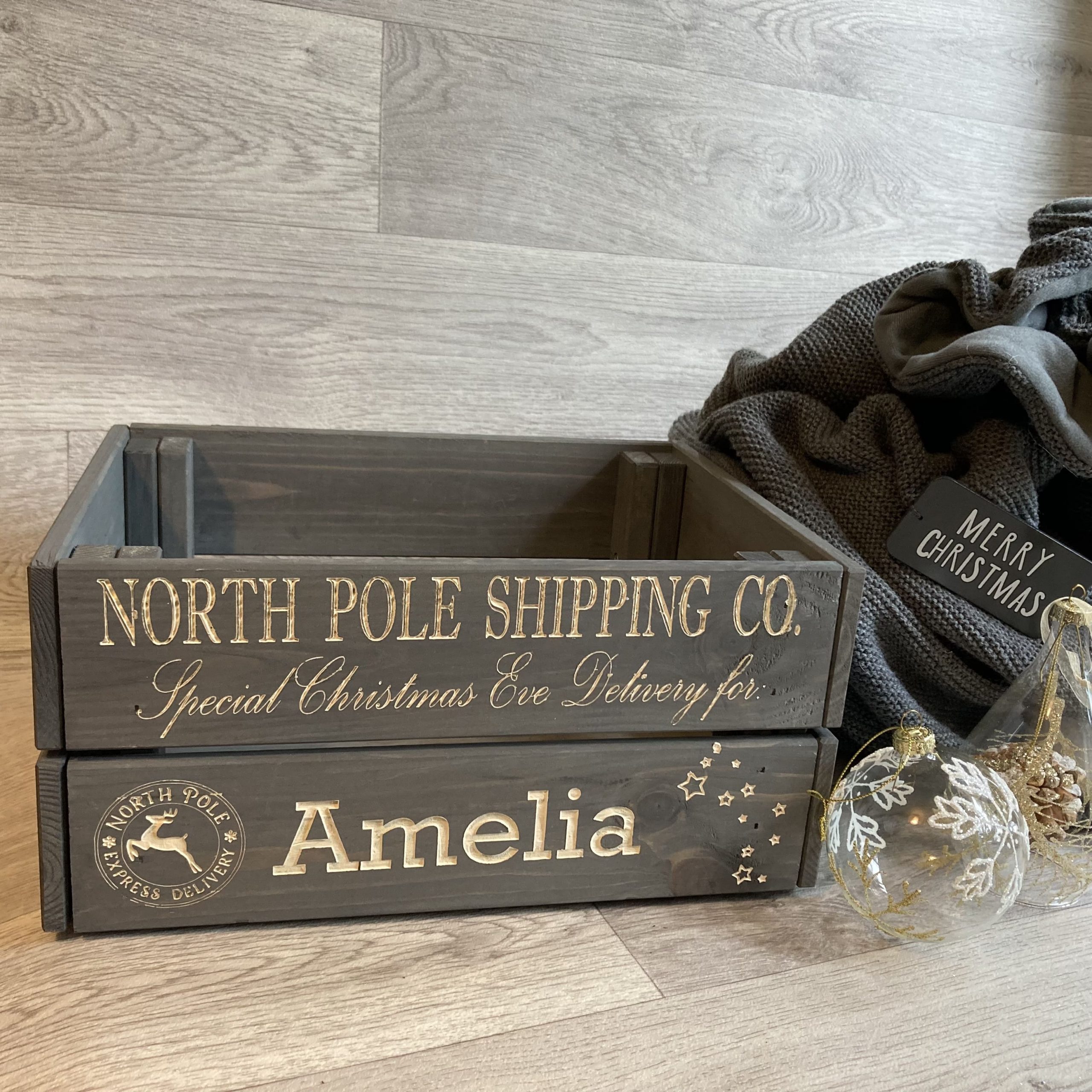 Engraved and hand painted personalised wooden crate in grey, perfect for those Christmas Eve treats such as PJ’s, slippers, hot chocolate etc.