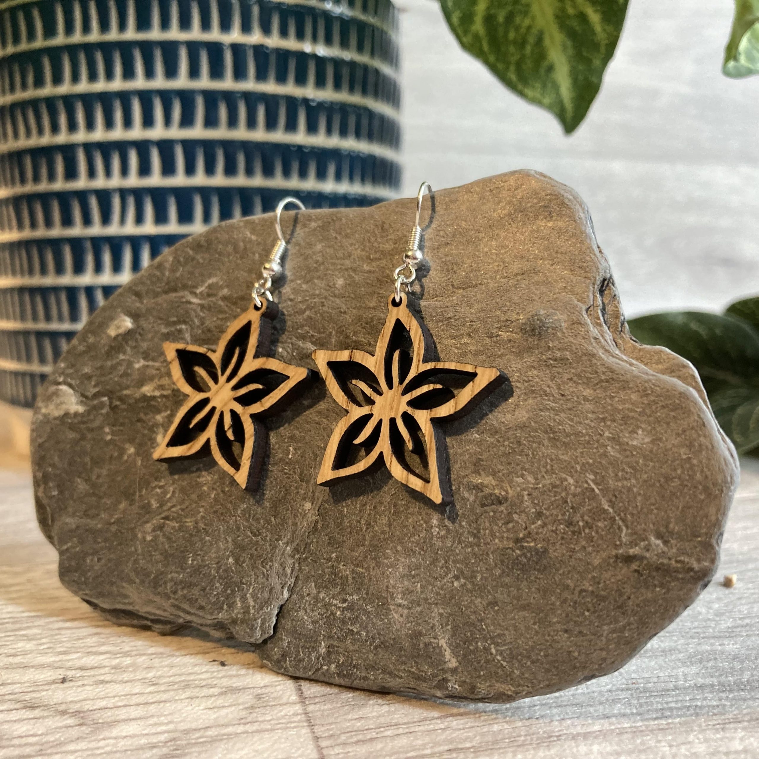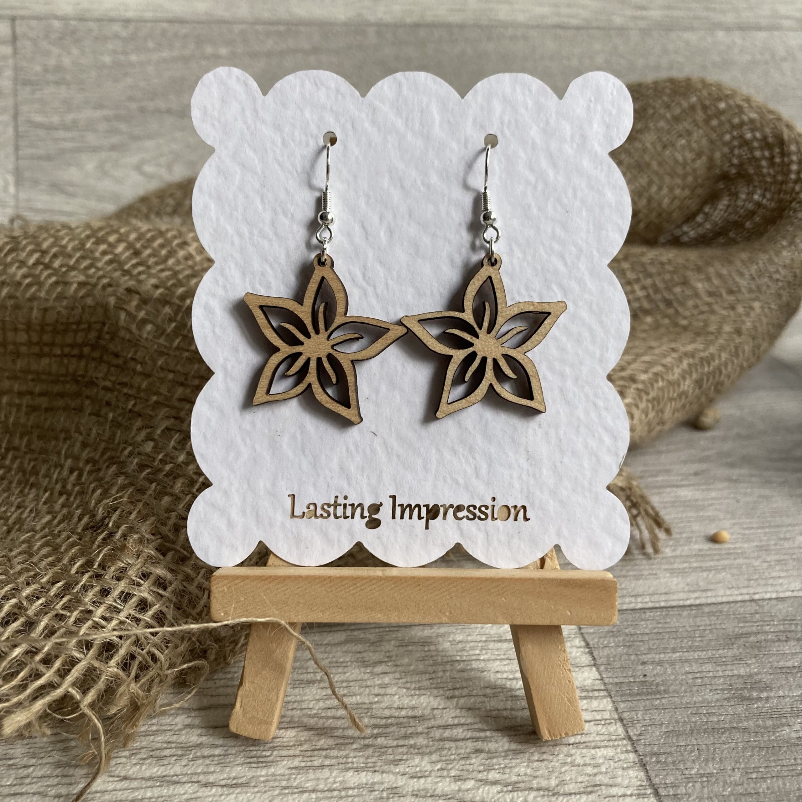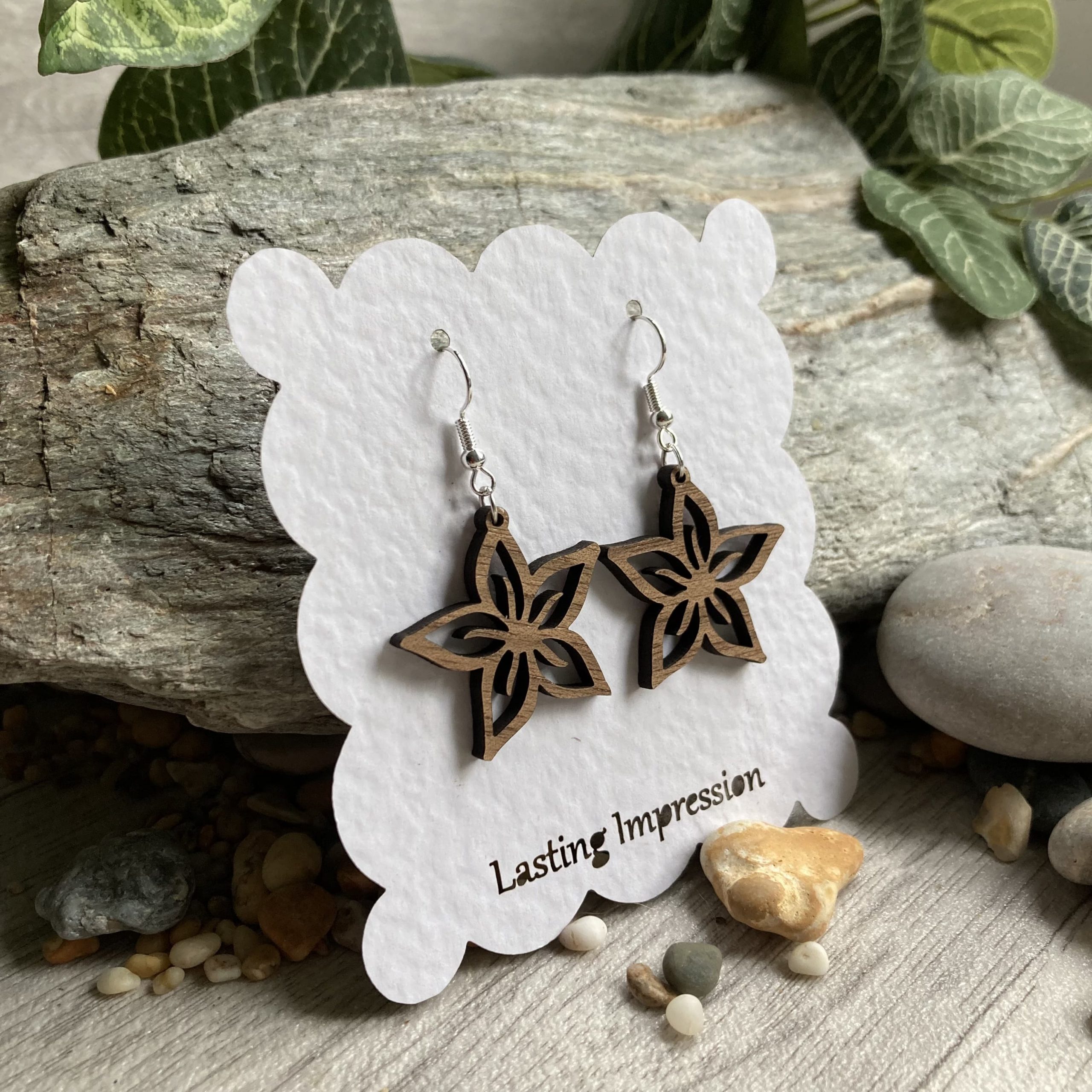 Pretty, lightweight floral earrings made in either Maple, Walnut or Oak.